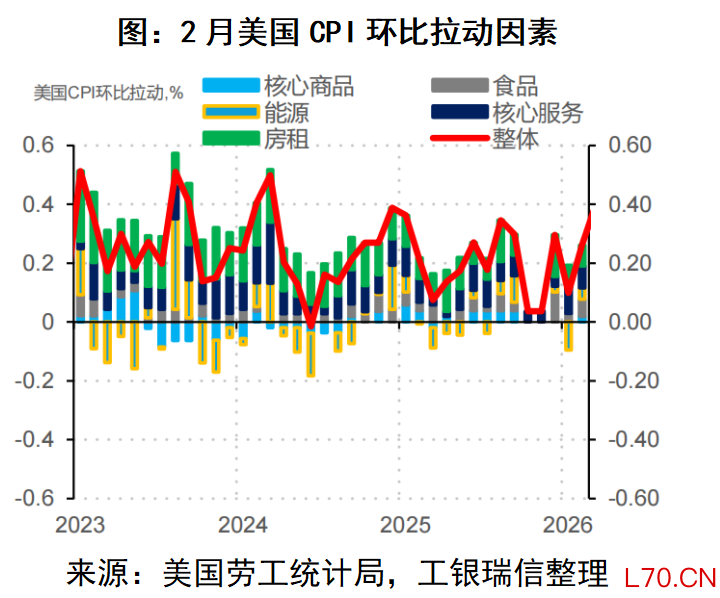 由于中东冲突在2月底才升级,对2月美国通胀数据影响较小。仅从2月数据来看,关税对核心商品价格的影响可控,核心服务走势也基本符合预期,超预期的分项在于2026年以来持续上行的食品价格。往后看,我们认为,美国通胀的上行风险不断提升。随着中东冲突引发油价上行,若油价呈现一次性上台阶,其对美国2026年CPI也将形成一次抬升;若油价持续上行,则将通过通胀预期的渠道对核心CPI形成进一步传导。