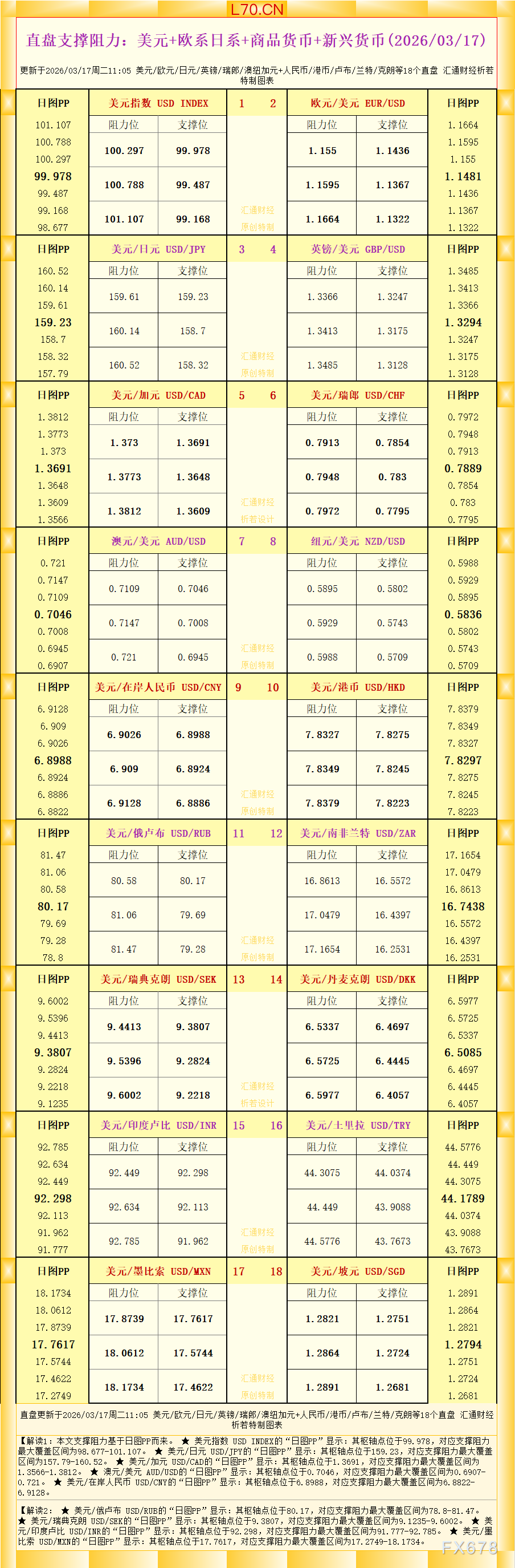 汇通财经APP讯——一张图看直盘支撑阻力:美元+欧系日系+商品货币+新兴货币,更新于2026年3月17日周二11:05,具体美元/欧元/日元/英镑/瑞郎/澳纽加元+人民币/港币/卢布/兰特/克朗等18个直盘,更多详见汇通财经析若特制图表中的内容。
