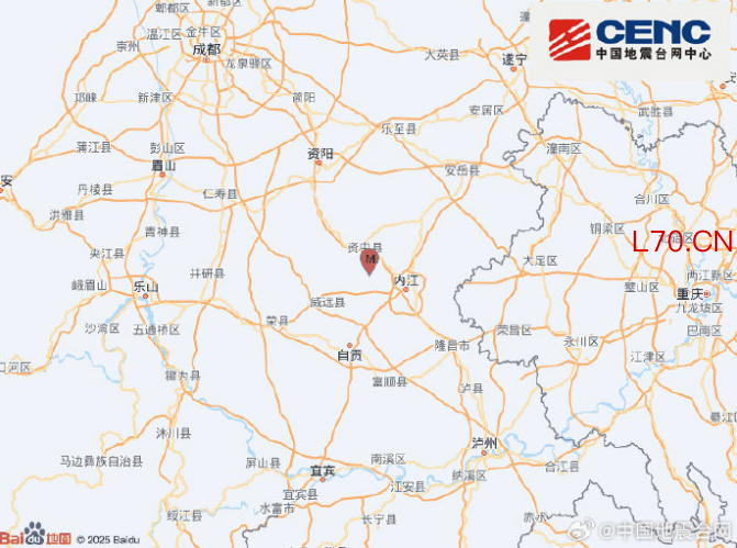 四川内江市资中县发生3.1级地震 震源深度5千米