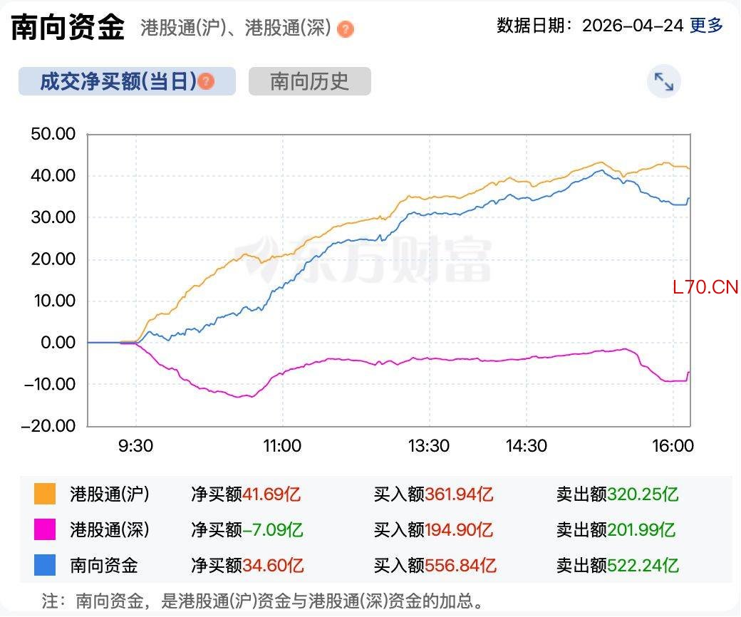 资金方面,南向资金今日继续净买入港股。截至收盘,南向资金累计净买入港股超34亿港元。