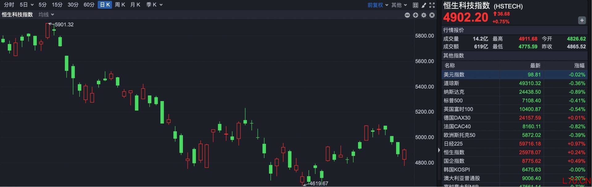 恒生科技指数收盘报4902.20点,上涨36.68点,涨幅0.75%。