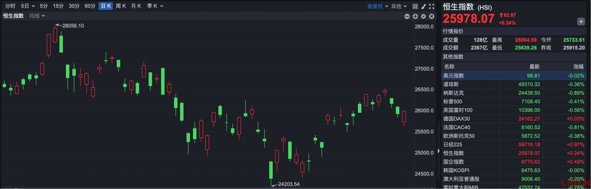 截至收盘,恒生指数报25978.07点,上涨62.87点,涨幅0.24%。