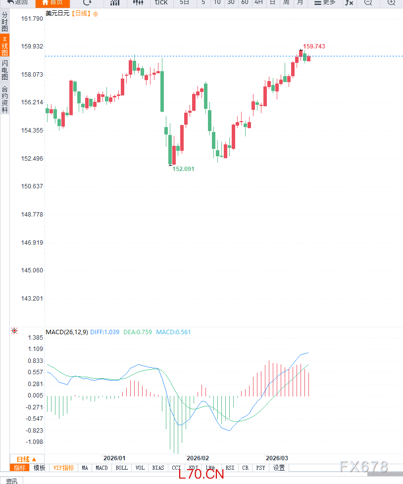 元股证券综合来看,美元兑日元短线虽有反弹动力,但上涨空间受片山警告和BoJ鹰派信号限制,同时中东油价飙升和美联储政策维持为美元提供支撑。投资者需关注日本潜在干预、油价波动及政策声明,以判断短期市场波动方向。美元兑日元日线图显示,汇率自近期低点反弹,短线形成震荡上行格局,目前在 159.40 附近整理。关键阻力位在 159.80、160.20和160.50,突破可能引发短线加速上涨;支撑位在 158.80、158.40和157.90,下方跌破将增加回调风险。4小时图显示,短线在 159.20-159.60 区间震荡,多空力量暂时均衡,均线趋平,MACD在零轴附近徘徊,显示短期动能偏弱。市场关注BoJ和美联储政策声明、片山干预言论以及中东油价波动,短期可能维持区间整理格局。